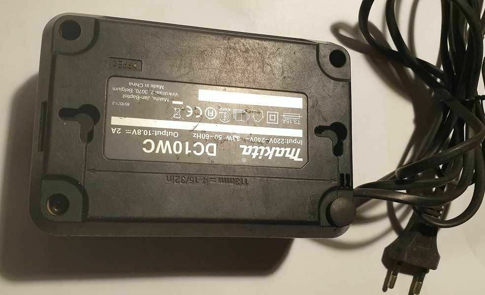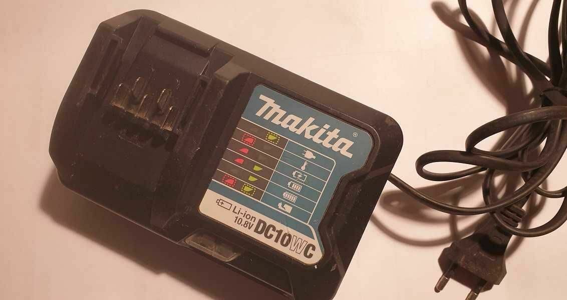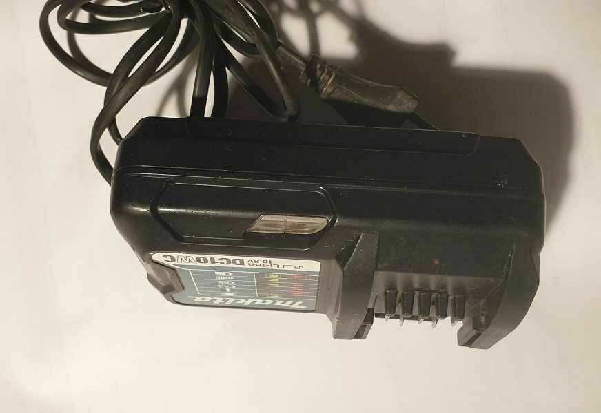 Ładowarka akumulatorowa Makita DC10WC. Urządzenie jest używane, ale w dobrym stanie technicznym. Pozwala na szybkie ładowanie akumulatorów Makita. Nadaje się do zastosowania w warsztacie lub na budowie.