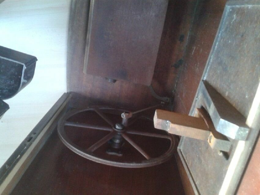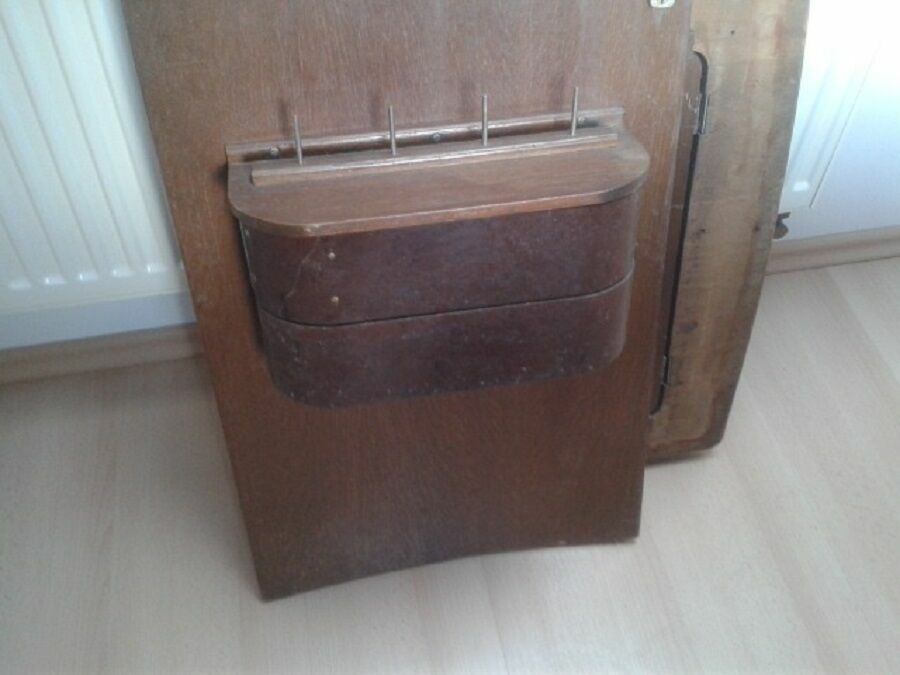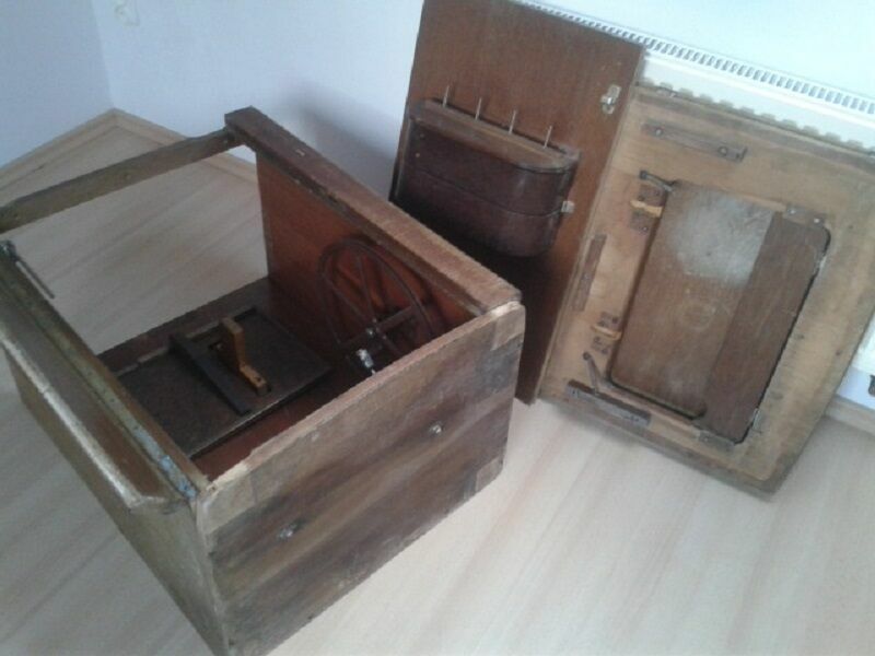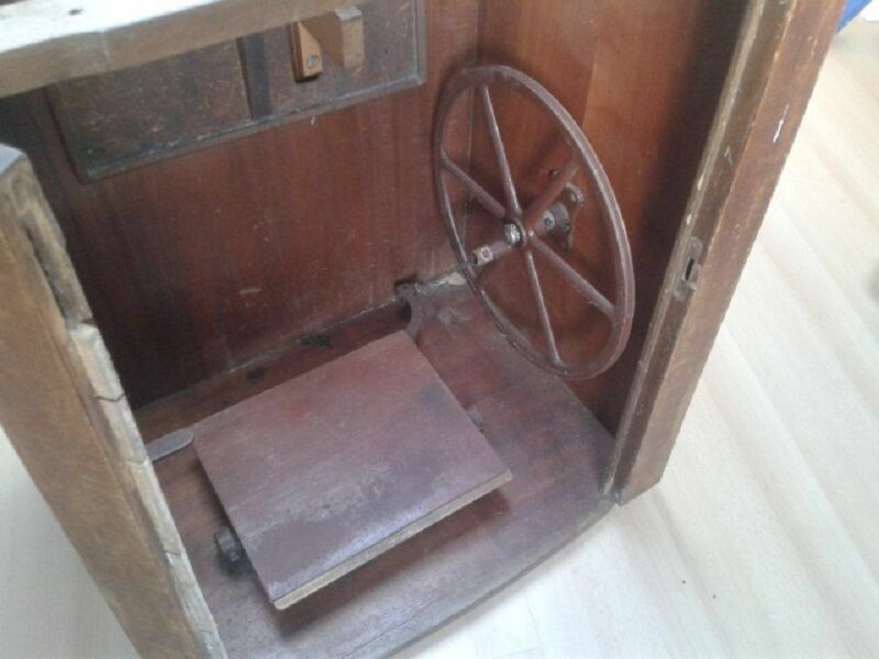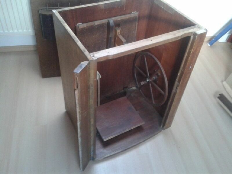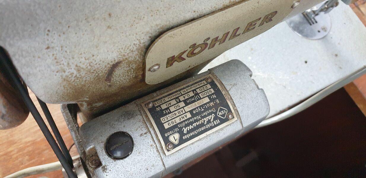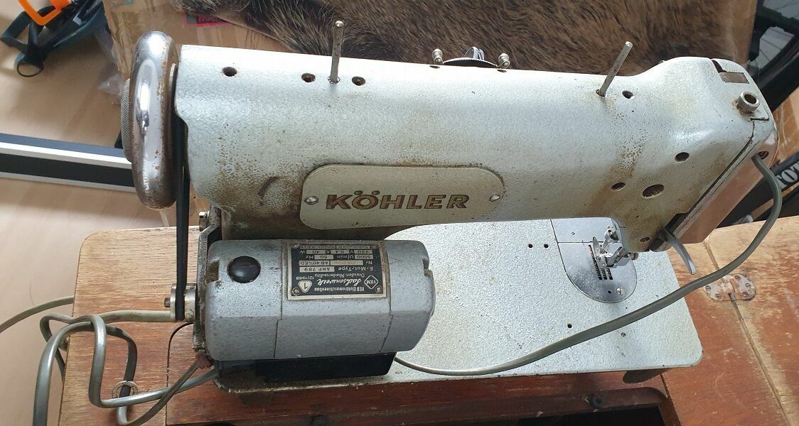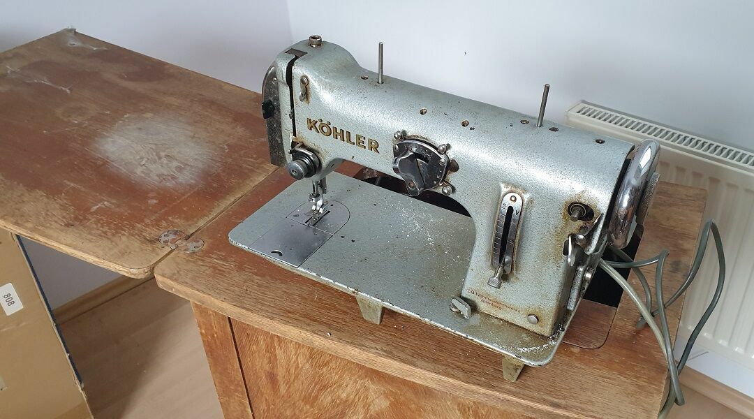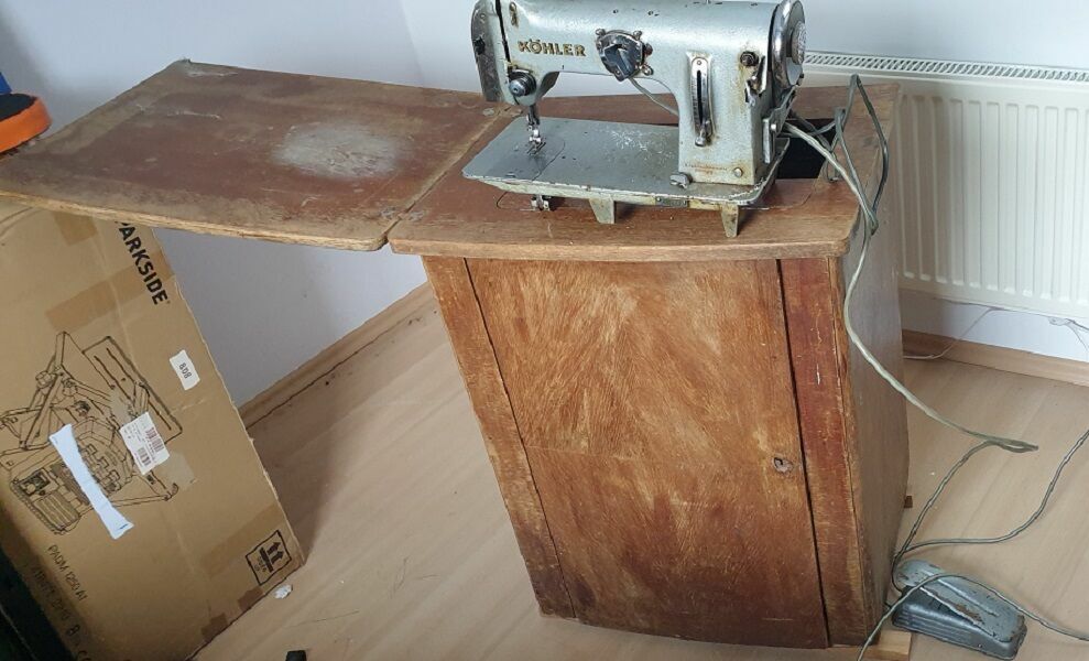 Maszyna do szycia firmy Kohler z podstawą szafką i urządzeniem pedałowym .Przedmiot do renowacji .