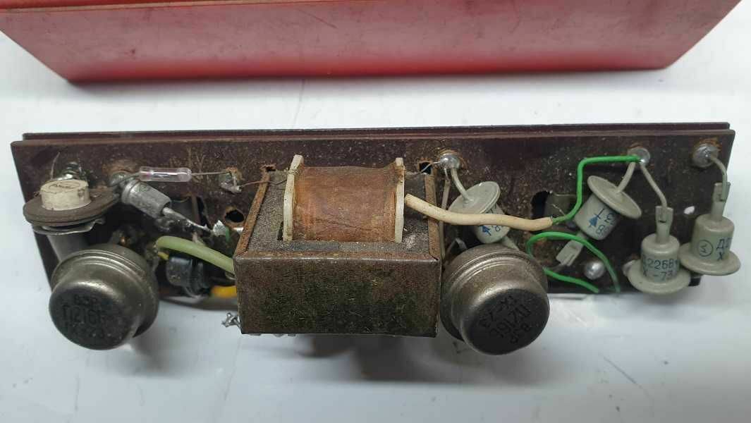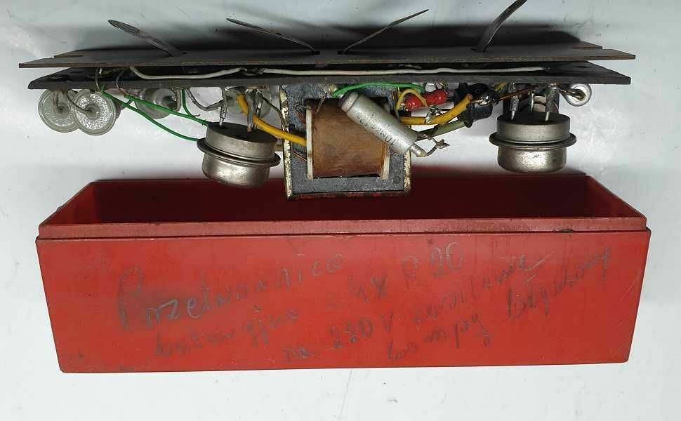 Przetwornica bateryjna do lampy błyskowej używana.Przetwornica z lat 70 wytwarzała napięcie z 4-baterij R20 na 220V które zasilało lampę błyskową .Urządzenie obecnie nie testowane ,sprzedaję jako uszkodzone ,to co na zdjęciu.Stan kolekcjonerski do renowacji.