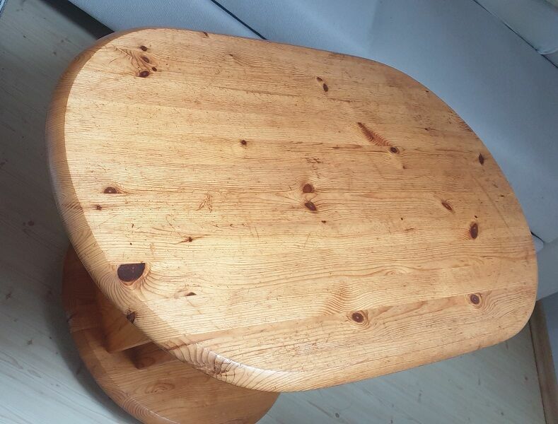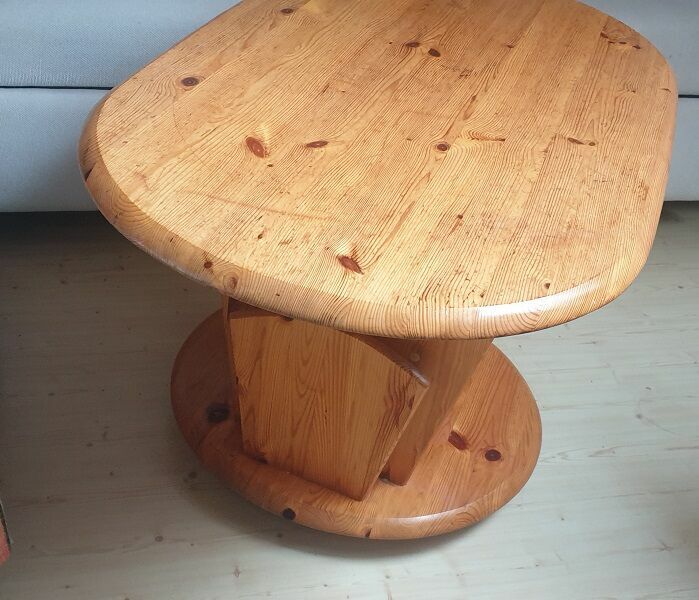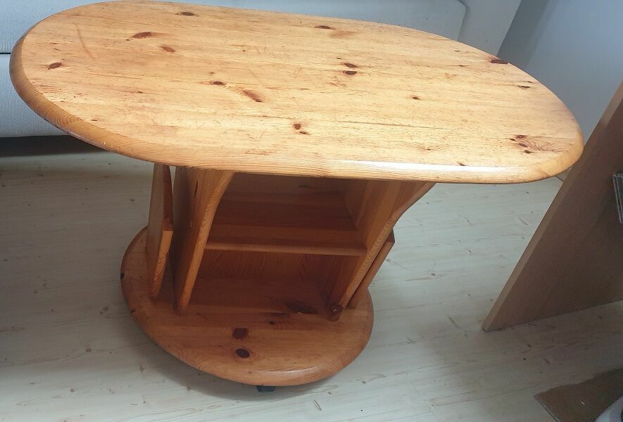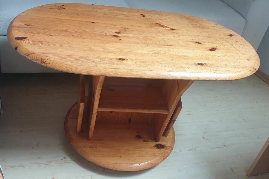 Solidny,mobilny, owalny stolik na gazety wykonany z drewna sosnowego. Posiada praktyczne półki na przechowywanie gazet i czasopism. Stolik jest używany, ale w dobrym stanie. Może służyć jako funkcjonalny mebel do salonu lub pokoju..wymiary dł.100x60x57cm wysokość